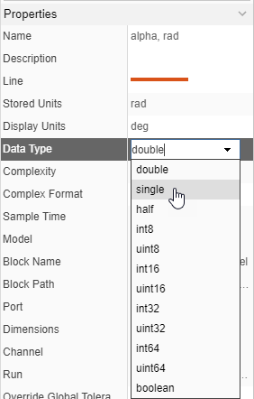 Тип данных для alpha, rad сигнал - double. Предположим, что требуется преобразовать тип данных в single. Сначала выберите alpha, rad сигнал. Затем разверните панель «Свойства» и щелкните белое текстовое поле рядом со свойством «Тип данных». Можно ввести single или выберите его из раскрывающегося списка типов данных. Инспектор данных моделирования преобразует данные при щелчке за пределами раскрывающегося списка.