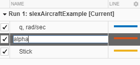 Регистрация q, rad/sec, Stick, и alpha, rad в Инспекторе данных моделирования выберите сигналы в модели. Затем щелкните правой кнопкой мыши по выделенному фрагменту и выберите в контекстном меню пункт «Регистрировать выбранные сигналы».