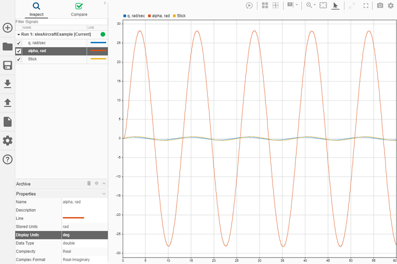 Имена сигналов можно изменить в инспекторе данных моделирования. Изменение имени сигнала в инспекторе данных моделирования не влияет на имена сигналов, указанные в модели. Можно указать новое имя в рабочей области, на панели «Архив» или на панели «Свойства». Чтобы изменить имя сигнала, щелкните имя сигнала и введите новое имя. Например, измените имя alpha, rad сигнал на alpha поскольку свойство Units теперь содержит информацию о единицах измерения.