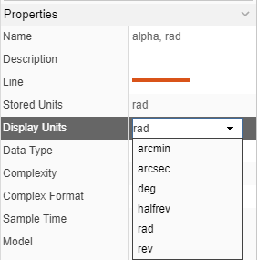 Чтобы указать единицы радиана для сигнала, на панели «Свойства» введите rad в белое текстовое поле рядом со свойством «Отображаемые единицы».