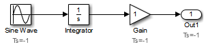 При обновлении или моделировании модели, определяющей время выборки исходного блока как наследуемого (-1), время выборки исходного блока может быть повторно разослано; Simulink ® может установить время выборки исходного блока идентичным времени выборки, заданному блоком, соединенным с исходным блоком, или унаследованному им. Например, в модели ниже программное обеспечение Simulink распознает, что блок синусоидальной волны управляет блоком интегратора дискретного времени, время выборки которого равно1; таким образом, он назначает блоку синусоидальной волны время выборки 1.