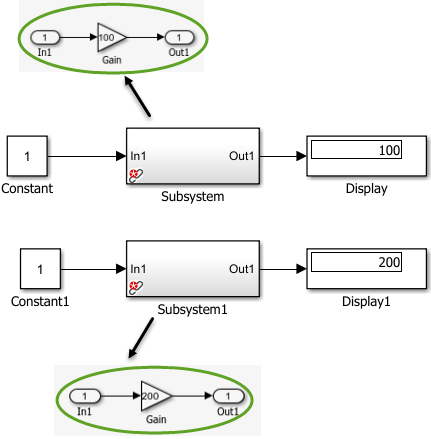 Теперь создается параметризованная связь, переопределяющая значение параметра (см. раздел Параметризованный связанный блок). Аналогично, измените Gain значение параметра Subsystem1 связанный блок.