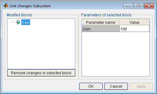 Можно изменять значения параметров дочерних блоков связанного блока без изменения значения родительского блока библиотеки. Например, можно изменить значение параметра блока усиления в пределах Subsystem связанный блок.