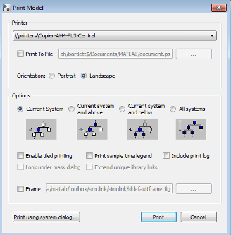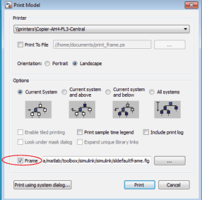 Если параметр «Рамка печати» включен, Simulink не использует плиточную печать.