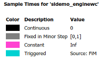 Образец легенды времени появляется на последней странице. Например, вот образец временной легенды для sldemo_enginewc модель, с включенными всеми системами.