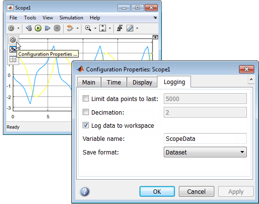 Сохраните или запишите данные сигнала в рабочую область MATLAB ®, а затем постройте график данных в окне изображения MATLAB. Для анализа данных используйте функции MATLAB или собственные сценарии. См. раздел Сохранение данных моделирования из плавающей области.