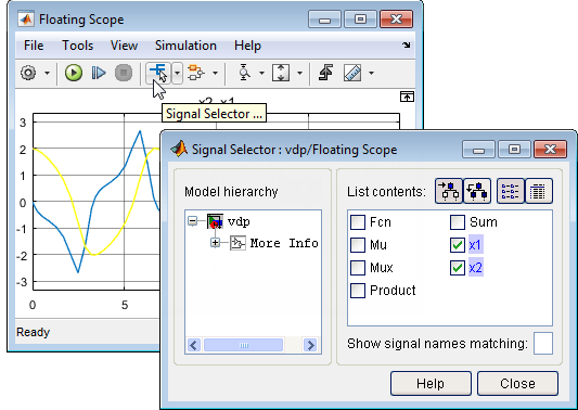 Прикрепление сигналов к блоку плавающей области или средству просмотра сигналов непосредственно из модели. См. раздел Добавление сигналов в существующую плавающую область или средство просмотра области.
