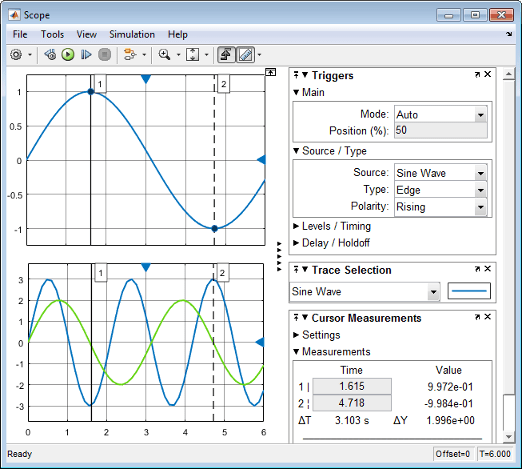 Для отладки модели используйте инструменты, похожие на осциллограф, доступные в области. Установите триггеры для регистрации событий, используйте интерактивные курсоры для измерения значений сигналов в различных точках и просмотрите статистику сигналов, такую как максимальное и среднее значения. См. Панель триггеров области и панель измерений курсора.