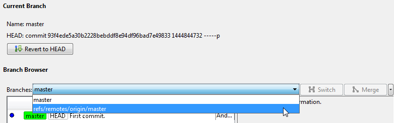 Закройте диалоговое окно «Ответвления». Обратите внимание на сообщение в области Git. Coincident with /origin/master. Теперь можно просматривать изменения, полученные и объединенные из удаленного репозитория, в локальных файлах изолированной программной среды.