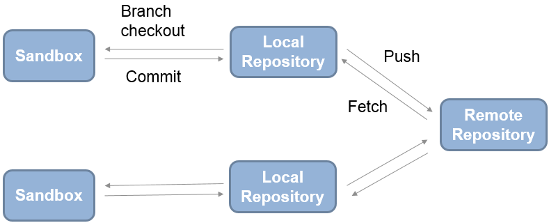 Этот рабочий процесс используется для работы с Git™ проектом, подключенным к удаленному репозиторию. В Git существует двухэтапный рабочий процесс: зафиксировать локальные изменения, а затем переместить в удаленный репозиторий. В проекте доступ к удаленному репозиторию осуществляется только с помощью кнопок Pull, Push и Fetch. Во всех других действиях используется локальный репозиторий (например, Проверка изменений, Сравнение с предком и Фиксация). Эта диаграмма представляет рабочий процесс Git.