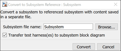 Укажите имя компонента подсистемы в поле Имя файла подсистемы. Имя должно быть допустимым именем MATLAB. При преобразовании создается файл подсистемы в текущей папке. Чтобы создать файл в определенном месте, нажмите кнопку Обзор и перейдите к месту сохранения. Затем перенесите существующие тестовые жгуты в блок-схему подсистемы. Для передачи тестовых жгутов установите флажок Передать тестовые жгуты на блок-схему подсистемы и нажмите кнопку Преобразовать.