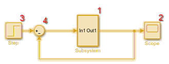 Чтобы отобразить порядок выполнения блока для этой модели и атомной подсистемы, на вкладке Отладка (Debug) выберите Информационные наложения (Information Overlays) > Порядок выполнения (Execution Order).