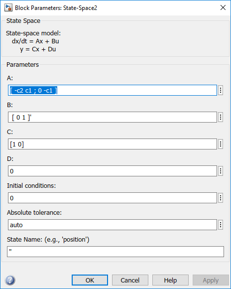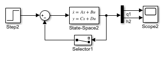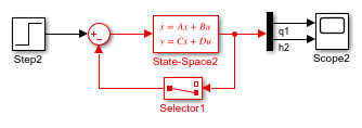 Теперь, вход (q1) не передается непосредственно на выход ( D матрица равна 0), поэтому блок State-Space больше не имеет прямого канала. Сигнал обратной связи теперь имеет только один элемент, поэтому блок селектора больше не нужен, как можно видеть в следующей модели.