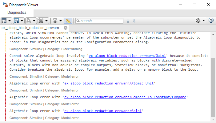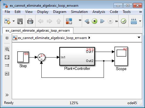 Если для диагностики алгебраического цикла установлено значение errorмоделирование модели приводит к ошибке, поскольку модель содержит искусственный алгебраический цикл, включающий ее атомарную подсистему.