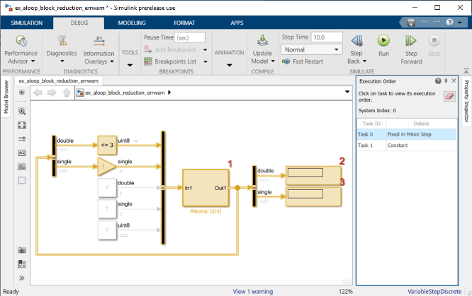 Если включить сокращение блоков и порядок выполнения и снова смоделировать модель, Simulink не отображает порядок выполнения для блоков, которые были сокращены. Теперь можно быстро увидеть, какие блоки были сокращены.