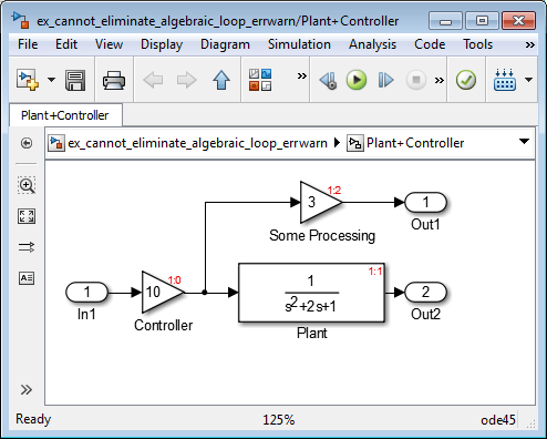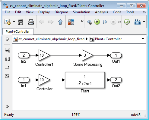 Можно изменить эту модель, чтобы исключить искусственный алгебраический цикл, переопределив атомарную подсистему, добавив дополнительные блоки Inport и Gain, как видно из модели. Это делает In1 непрямым и In2 прямым, тем самым разрывая алгебраический цикл.