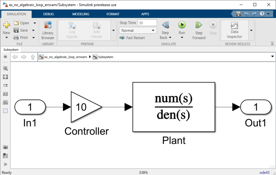 В этой модели подсистема Plant + Controller вызывает алгебраический цикл, но имеет дополнительный блок усиления и дополнительный выход.