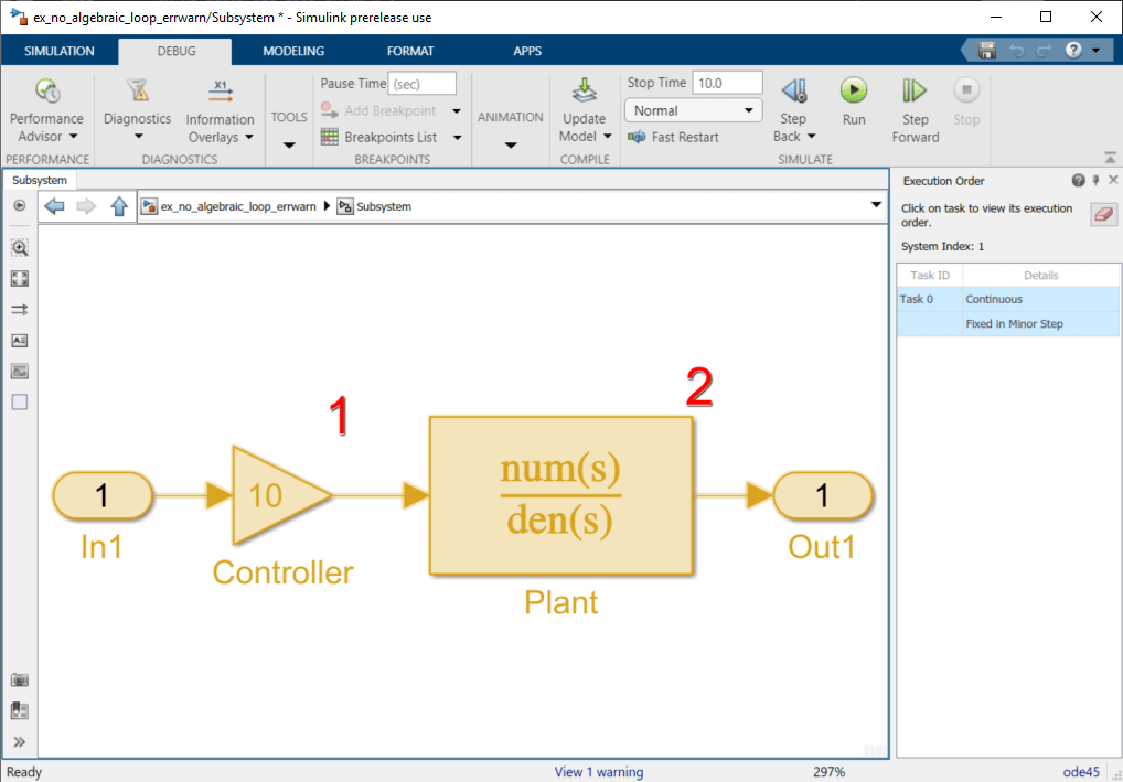 При моделировании этой модели с параметром алгебраического цикла, равным warn или error, Simulink идентифицирует алгебраический цикл.