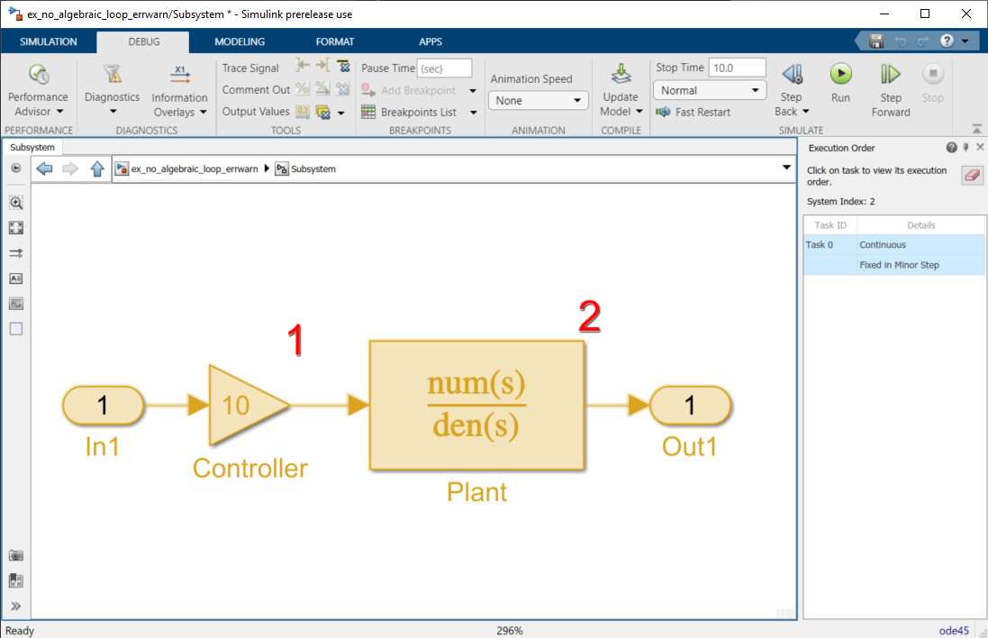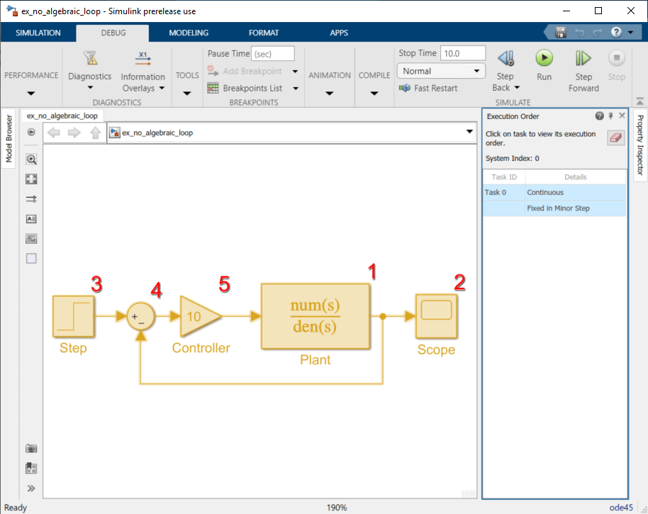 В первоначальной версии этой модели выполнение mdlOutputs метод начинается с блока Plant, поскольку блок Plant является непрямым каналом. Выполнение завершается блоком контроллера.