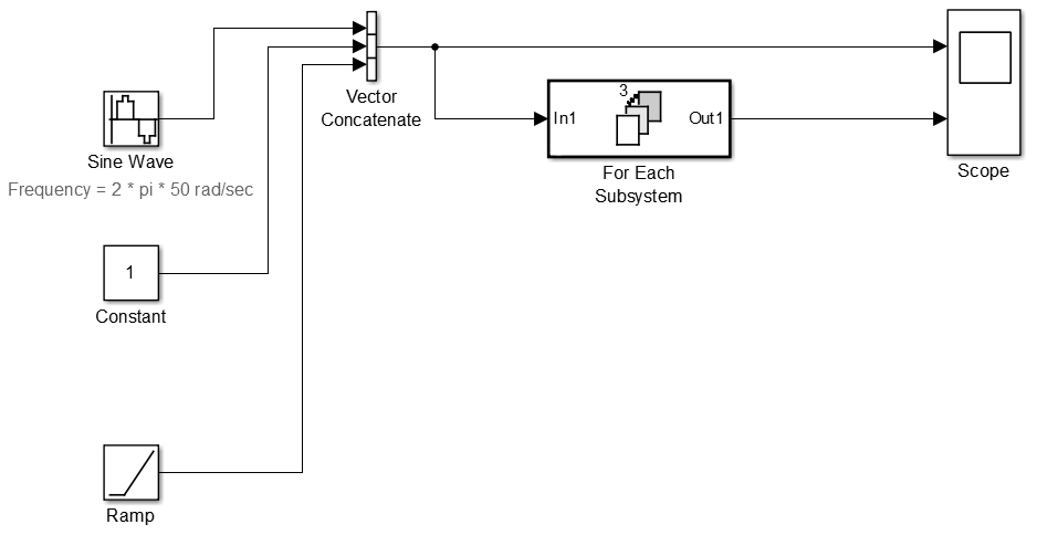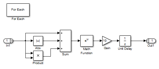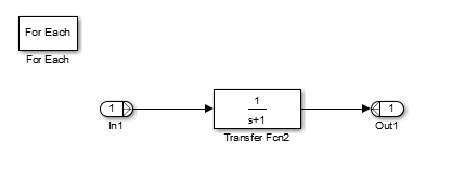 Блок подсистемы For Each содержит блок For Each и модель, представляющую алгоритм трех блоков, которые он заменяет посредством блока Transfer Fcn. Блок «Для каждого» определяет, как разделить вектор входного сигнала на отдельные элементы и как объединить обработанные сигналы для формирования вектора выходного сигнала. Каждый блок, который имеет состояние, поддерживает отдельный набор состояний для каждого входного элемента, обрабатываемого на данном этапе выполнения.