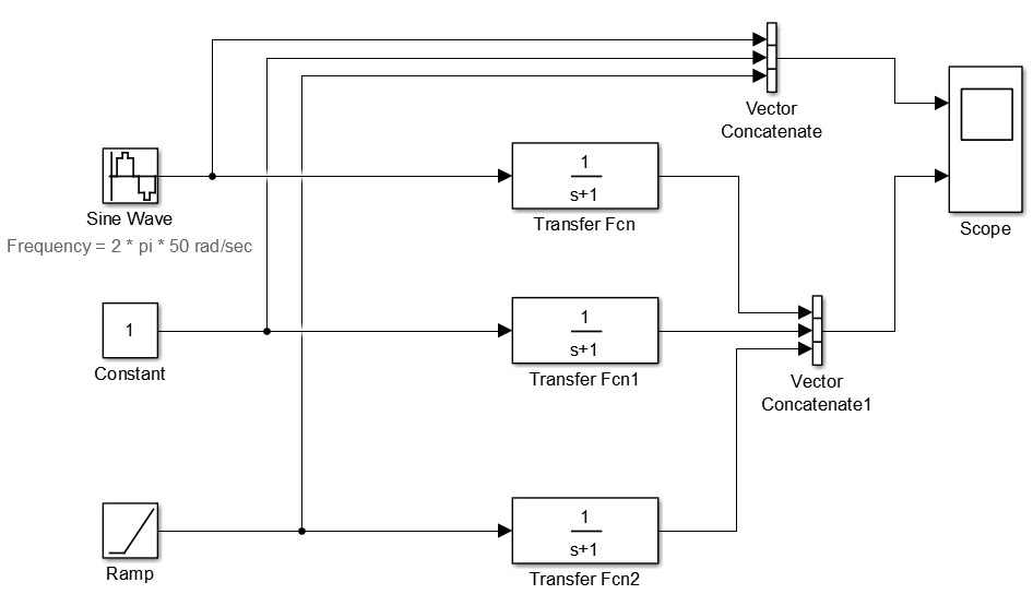 Эта модель использует идентичные блоки Transfer Fcn для независимой обработки каждого элемента входного синусоидального сигнала. Блок векторной конкатенации объединяет результирующие выходные сигналы. Этот повторяющийся процесс является графически сложным и трудным в обслуживании. Добавление еще одного элемента в сигнал также требует существенной переработки модели.