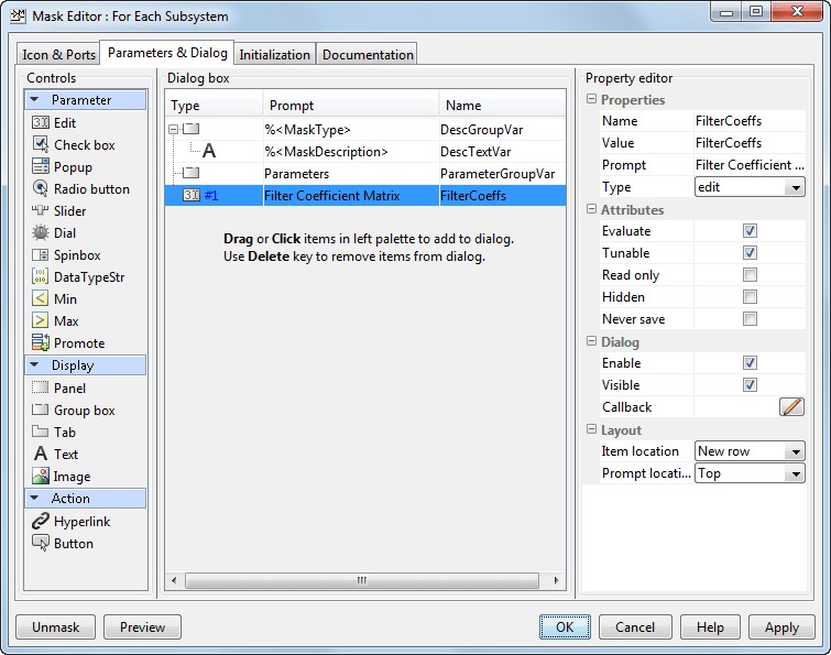 Откройте ex_ForEachSubsystem_Partitioning модели. Создайте маску для блока «Для каждой подсистемы» и добавьте редактируемый параметр маски. Задайте для имени значение FilterCoeffs и подсказку для Filter Coefficient Matrix. Дополнительные сведения о добавлении параметра маски см. в разделе Создание простой маски.