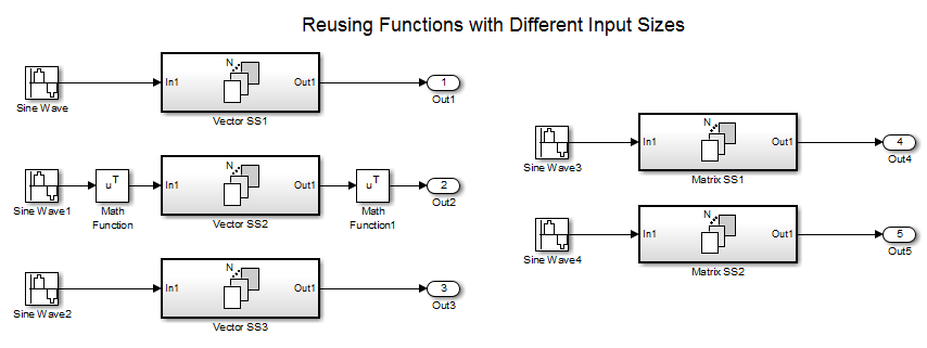 Чтобы создать одну общую функцию для трех подсистем, конфигурация разделения, которое они выполняют для своих входных сигналов, должна быть одинаковой. Для Vector SS1 и Vector SS3 эта конфигурация проста, поскольку можно задать размер и ширину секционирования равным 1. Однако для того, чтобы вектор SS2 также разделил свой входной сигнал вдоль размера 1, необходимо вставить блок Математическая функция (Math Function), чтобы перенести вектор строки 1 на 8 в вектор столбца 8 на 1. Затем можно преобразовать выходные данные подсистемы обратно в вектор строк 1 на 8, используя второй блок математической функции, установленный в transpose оператор.