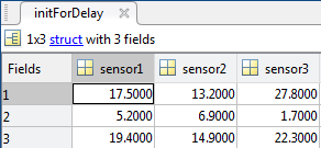 Просмотр содержимого новой переменной initForDelayдважды щелкните имя переменной в базовой рабочей области. Переменная содержит массив из трех структур, каждая из которых имеет три поля: sensor1, sensor2, и sensor3.