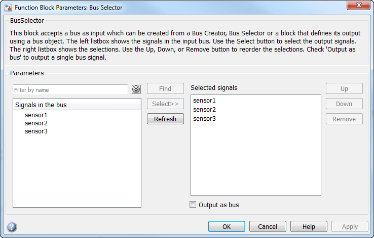 В диалоговом окне «Bus Selector block» выберите сигналы. sensor1, sensor2, и sensor3.