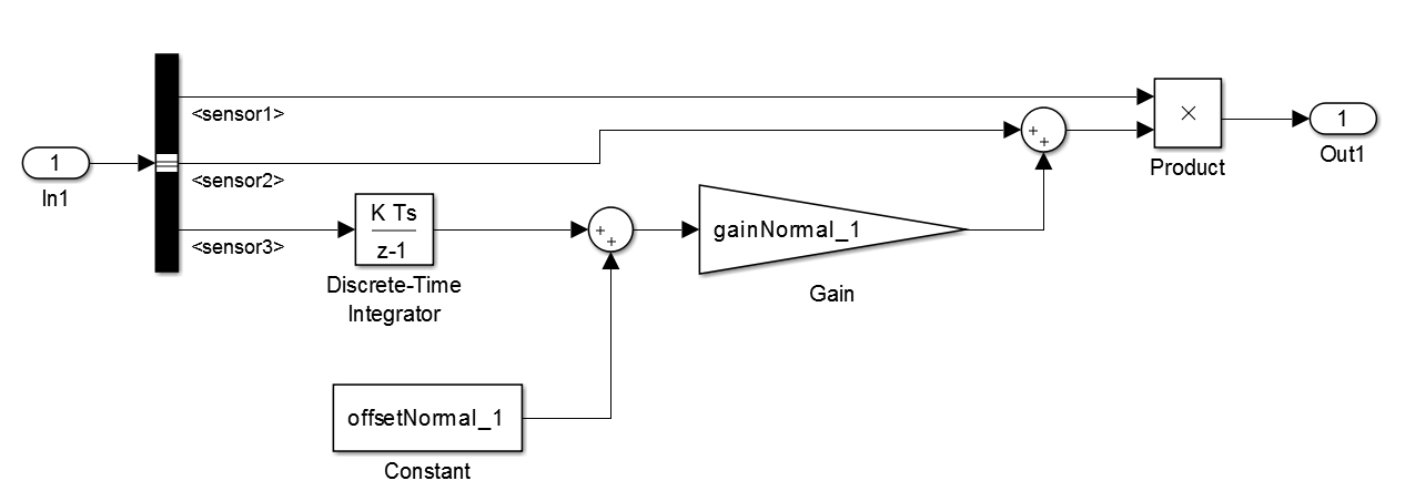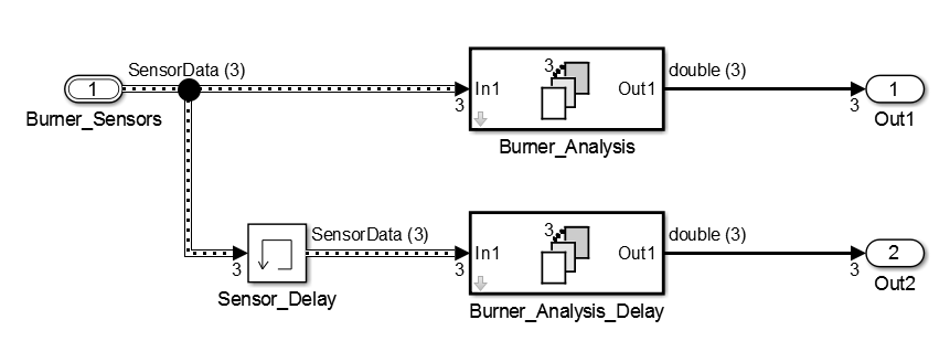Выходной сигнал блока представляет собой шину, которая содержит три сигнальных элемента. sensor1, sensor2, и sensor3.