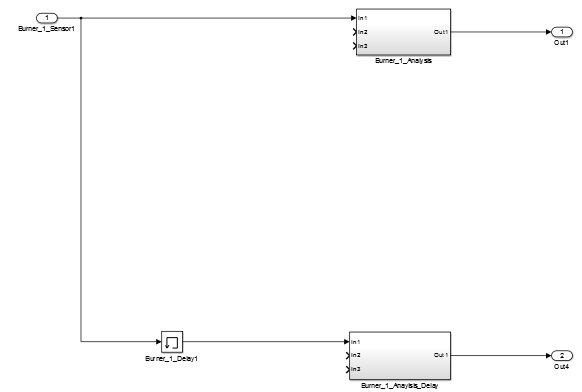 Удалите блоки, как показано на рисунке, оставив только блоки Burner_1_Sensor1 и Burner_1_Delay1 в качестве входных данных для двух оставшихся подсистем.