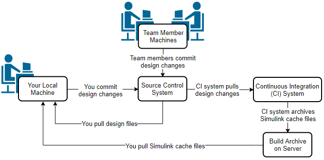Участники группы или системы непрерывной интеграции (CI) могут создавать файлы кэша Simulink для используемых моделей. Чтобы сократить время, необходимое при первой сборке этих моделей, можно скопировать соответствующие файлы кэша Simulink в локальную папку, заданную настройкой папки кэша Simulation. Simulink извлекает любое содержимое файла кэша Simulink, которое отличается от содержимого на диске. Если Simulink генерирует или обновляет артефакты построения на диске, он локально обновляет соответствующие файлы кэша Simulink.