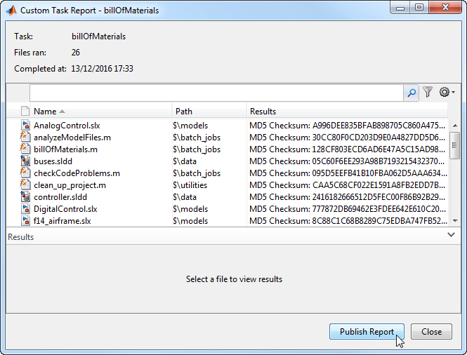 Например, функция пользовательской задачи «Создать отчет по спецификации» создает список файлов проекта, их статуса системы управления версиями, номеров редакций и контрольных сумм MD5. Код для этой пользовательской задачи можно просмотреть в файле billOfMaterials.m.