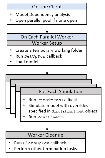 parsim позволяет выполнять параллельное (одновременное) моделирование модели (конструкции) Simulink ®. В этом контексте параллельные прогоны означают одновременное многократное моделирование различных работников .parsim упрощает выполнение одной и той же модели с различными входами или различными настройками параметров в таких сценариях, как анализ Монте-Карло, протягивание параметров, тестирование модели, конструирование эксперимента и оптимизация модели. Параллельное выполнение одного моделирования путем разложения модели на более мелкие компоненты и одновременное выполнение этих отдельных элементов на нескольких рабочих не поддерживается в настоящее время.