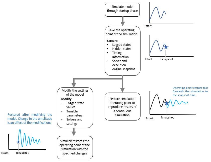 Для эффективного проектирования системы необходимо итеративно моделировать модель, чтобы можно было анализировать систему на основе различных входных данных, граничных условий или рабочих условий. Во многих приложениях при выполнении нескольких симуляций общая фаза запуска со значительным динамическим поведением. Например, взлет холодного запуска газотурбинного двигателя происходит перед каждым набором маневров самолета. В нескольких моделированиях в идеале: