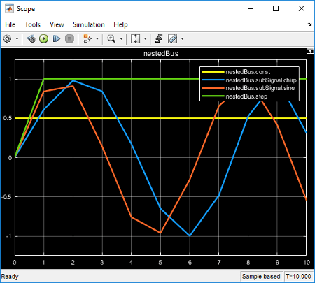 Сигналы от невиртуальных шин и массивов шин можно подключать к блоку Scope. Для отображения сигналов шины используется режим моделирования normal или accelerator. Блок «Scope» отображает каждый сигнал элемента шины в порядке, в котором элементы появляются в шине, сверху вниз. Вложенные элементы шины распрямлены. Например, в этой модели nestedBus сигнал имеет const, subSignal, и step сигналы как элементы. subSignal sub-bus имеет chirp и sine сигналы в качестве элементов шины. В блоке «Scope» два элемента subSignal отображение шины между const и step сигналы.