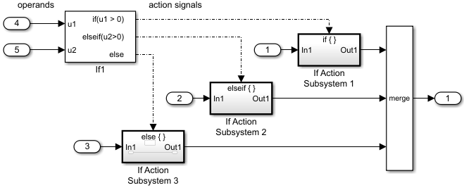 Подключите выходы из блоков подсистемы If Action к блоку Merge.