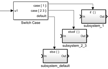 Блок Switch Case Action Subsystem является блоком Subsystem, предварительно сконфигурированным в качестве начальной точки для создания подсистемы, выполнение которой разрешено блоком Switch Case.