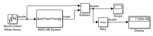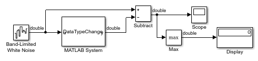В файле определения класса укажите, как управлять типом выходных данных из системного блока MATLAB. Используйте getOutputDataTypeImpl изменение типа выходных данных с двойного на одиночный или распространение входных данных как двойных. Также показано, как привести тип данных к изменению типа выходных данных в stepImpl способ, при необходимости.