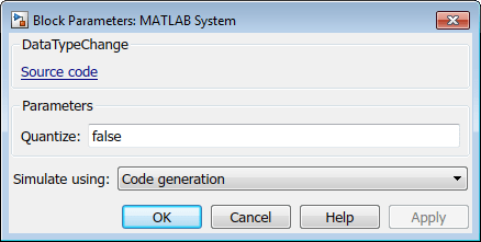 Маска блока для системного блока MATLAB включает в себя поле редактирования для переключения между использованием распространения (Quantize = false) и переключение с двойного на одиночный (квантование = true).