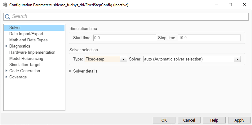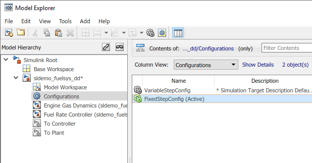 Модель sldemo_fuelsys_dd содержит один набор конфигурации, в котором используется решатель с переменным шагом. Добавьте другую конфигурацию для использования решателя с фиксированным шагом.