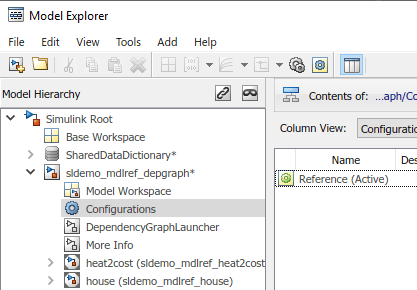В обозревателе моделей на панели Иерархия моделей (Model Hierarchy) разверните вкладку sldemo_mdlref_depgraph и выберите узел Конфигурации.