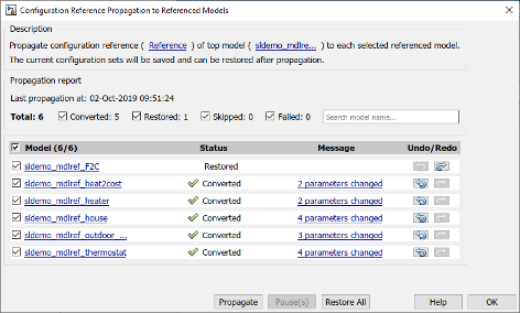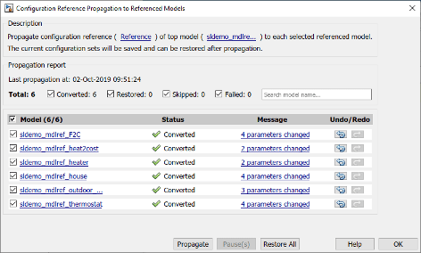 Механизм распространения сохраняет исходные параметры конфигурации для каждой ссылочной модели, чтобы можно было отменить распространение. Щелкните Распространить (Propagate).