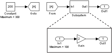 В этой модели блок Constant задает свой параметр Output maximum равным 300, а для блока Inport установлено значение 100. Предположим, что включена диагностика проверки диапазона моделирования и моделирование модели. Блок Inport обратно распространяет свое максимальное значение на предшествующий ему невиртуальный блок, т.е. блок Constant. Затем Simulink использует меньшее из двух максимальных значений для проверки сигнала, выводимого блоком Constant. Поскольку блок константы выдает сигнал, значение которого (200) превышает самый плотный диапазон, Simulink генерирует ошибку.