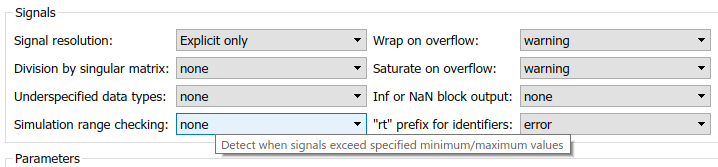В дереве Выбрать (Select) в левой части диалогового окна Параметры конфигурации (Configuration Parameters) щелкните категорию Диагностика (Diagnostics) > Валидность данных (Data Validity). В правой части раздела «Сигналы» установите диагностику проверки диапазона моделирования в значение error или warning.