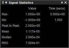 Отображение статистики сигнала, выбранного на панели Trace Selection. Чтобы открыть панель Статистика сигналов (Signal Statistics):