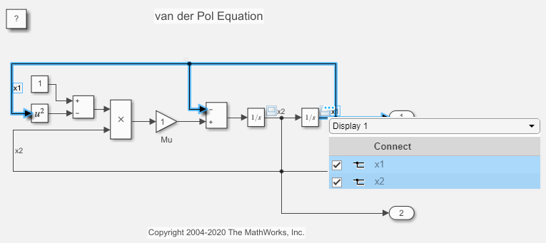 В этом примере используется измененная версия vdp модель. В этом примере плавающая область связана с x1 и x2 сигналы.