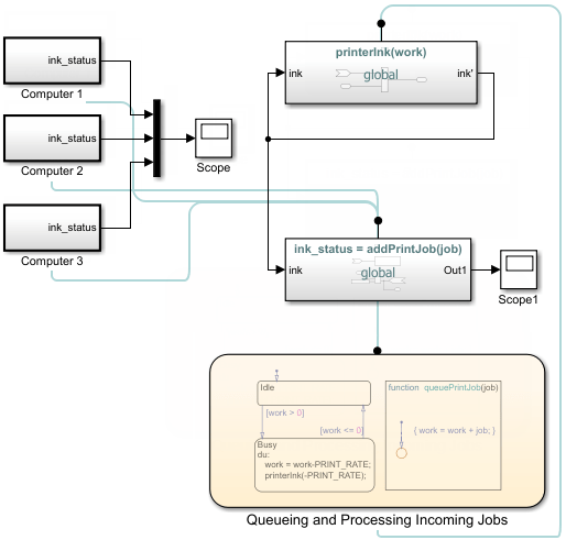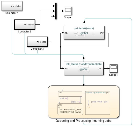 Используйте функции при моделировании общего ресурса, например принтера. Модель slexPrinterExample использует функциональные блоки Simulink в качестве общего интерфейса между несколькими компьютерами и одной диаграммой Stateflow, моделирующей процесс печати.