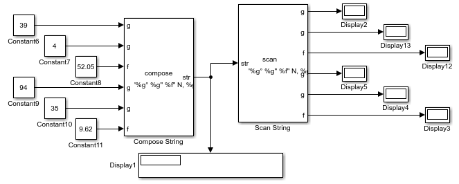 Строковые литералы задаются двойными кавычками ("Hello") или одиночные цитаты ('Hello'). Для согласования со строками MATLAB используйте двойные кавычки. Строки появляются на портах и в блоке Display с двойными кавычками.