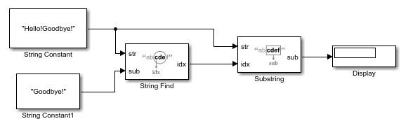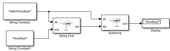 Моделирование модели и наблюдение за содержимым блока «Отображение». В этом примере отображается блок "Goodbye!", которая является выделенной подстрокой, начиная idx до конца строки.